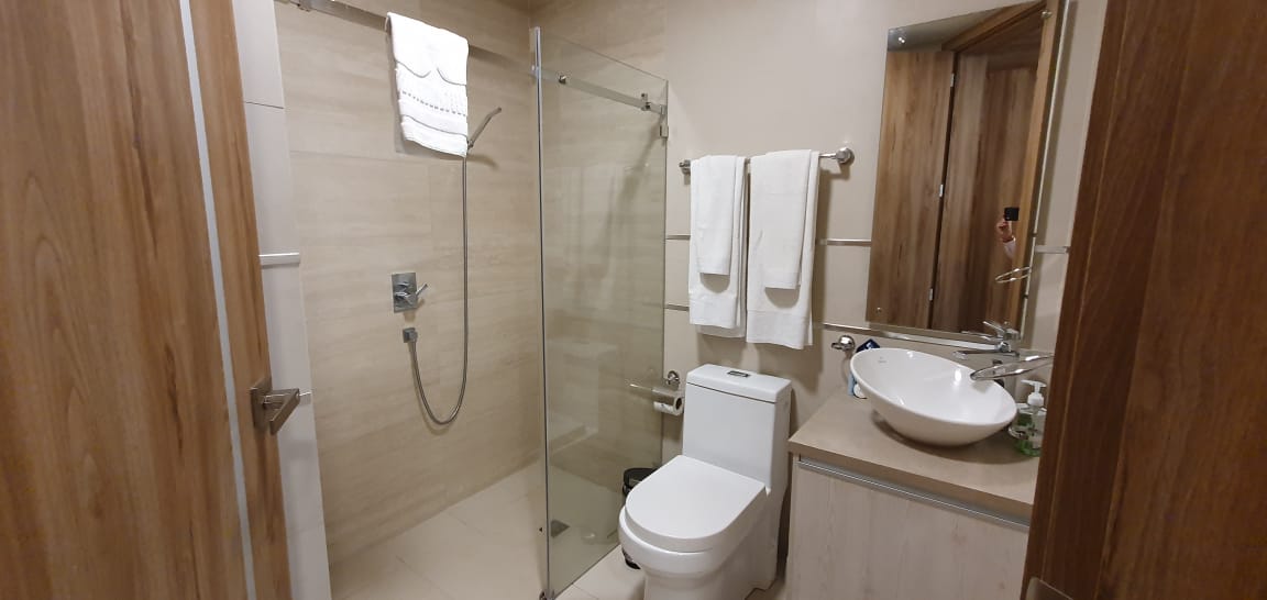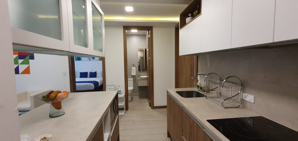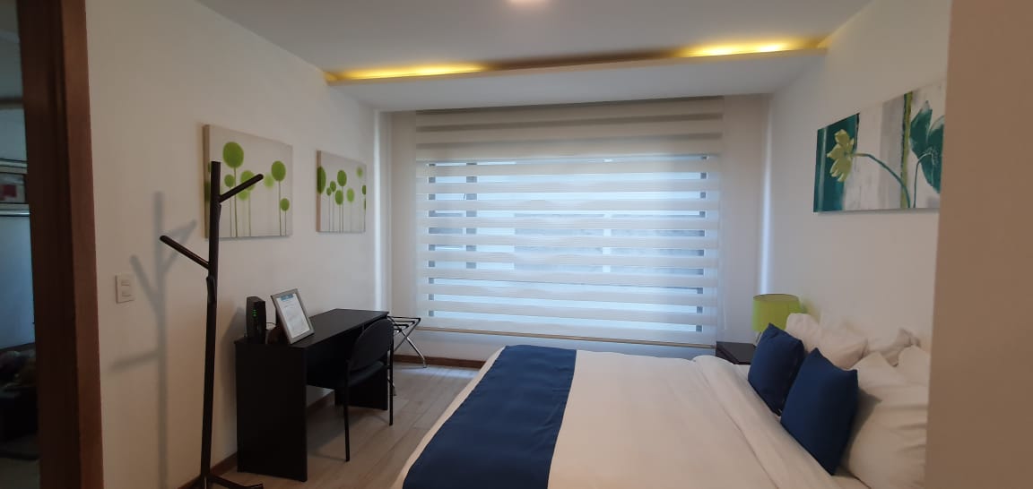 Elegant suite in smart building with excellent communal services. American-style kitchen with breakfast bar, bedroom with private bathroom, queen bed. Social bathroom, Includes free laundry service. Parking
